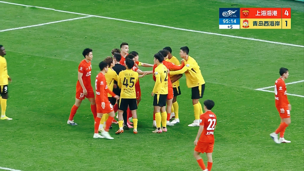 两队不断做出换人,第71分钟刚刚登场的武磊,禁区内连续两脚射门,洞穿李昊的十指关,3:0!比赛大势已去。几分钟,安佩姆边路戏耍对手,横传禁区后,武磊轻松推射破门,4:0!第80分钟,戴维森传入禁区,插上的梅米舍维奇头球破门,4:1!补时阶段,武磊干扰门将吃到黄牌,随后双方爆发冲突,最终全场比赛结束,青岛西海岸客场完败。
